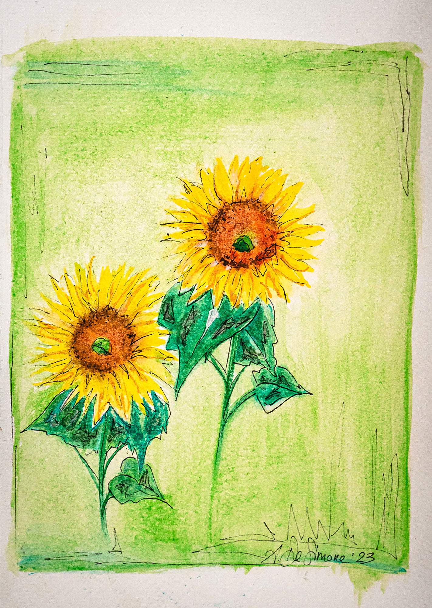 Two cherubic infants gaze in wonder at a pair of vibrant sunflowers in this endearing watercolor. With each brushstroke, the artist captures the innocence and joy of childhood, infusing the scene with warmth and tenderness.