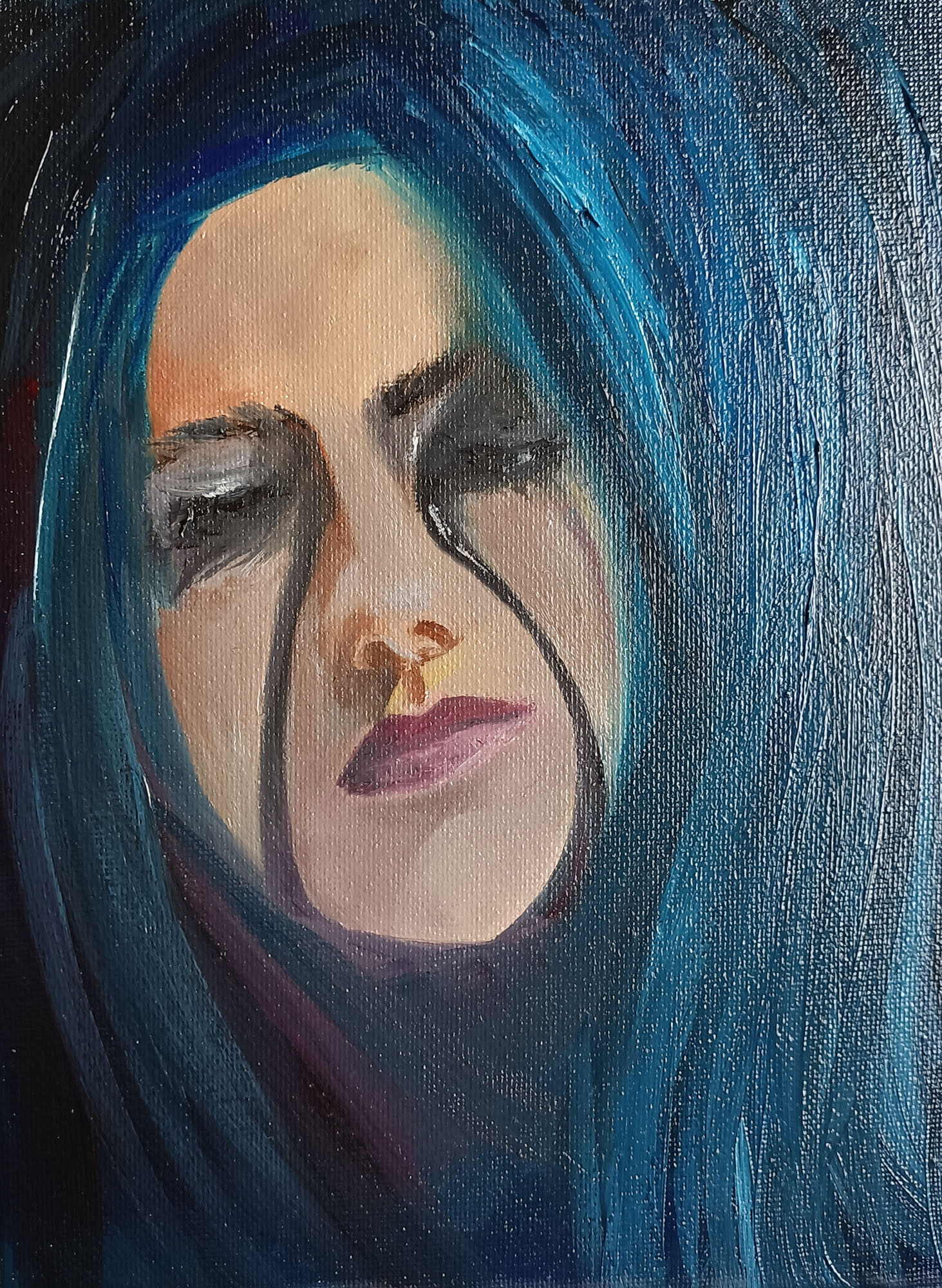 The deep, somber hues of the tears reflect the singer's vulnerability, offering a glimpse into her inner turmoil and emotional depth. Against a backdrop of muted tones, the contrast of the vivid blue tears serves as a powerful focal point, conveying a sense of profound melancholy and introspection.