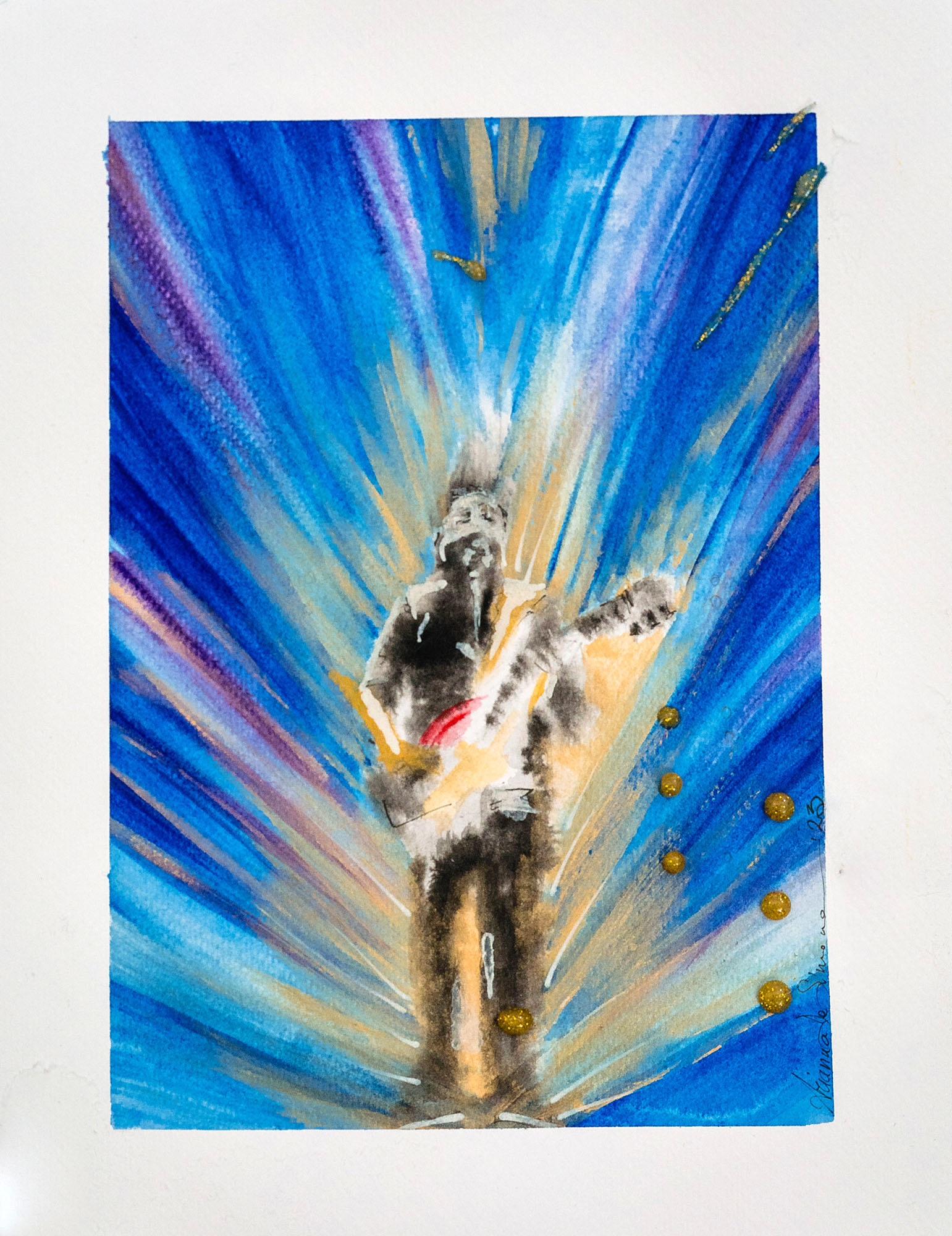 A watercolor portrait of a beloved musician comes to life with bursts of light and color. With each brushstroke, the artist pays homage to the melodies that stir the soul, infusing the painting with a sense of rhythm and harmony.