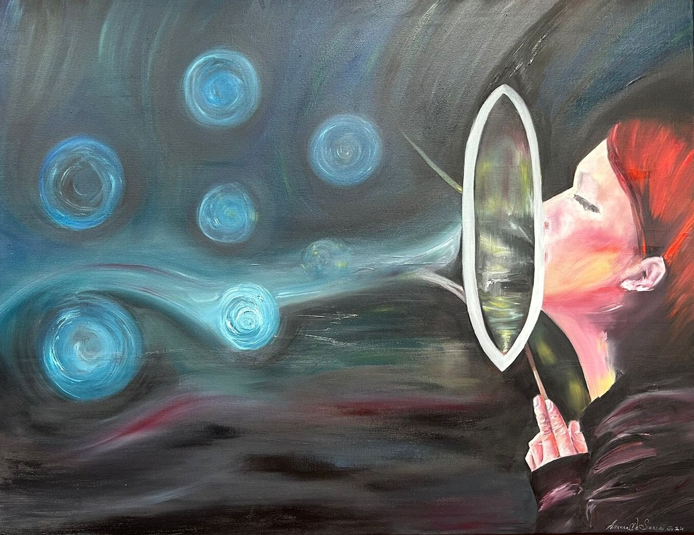 In this poignant artwork, Arianna De Simone transports viewers into a realm of ethereal beauty and profound empathy. Against a backdrop of serene azure hues, the central focus of the painting emerges—a figure, delicate yet resolute, blowing bubbles of shimmering cerulean.